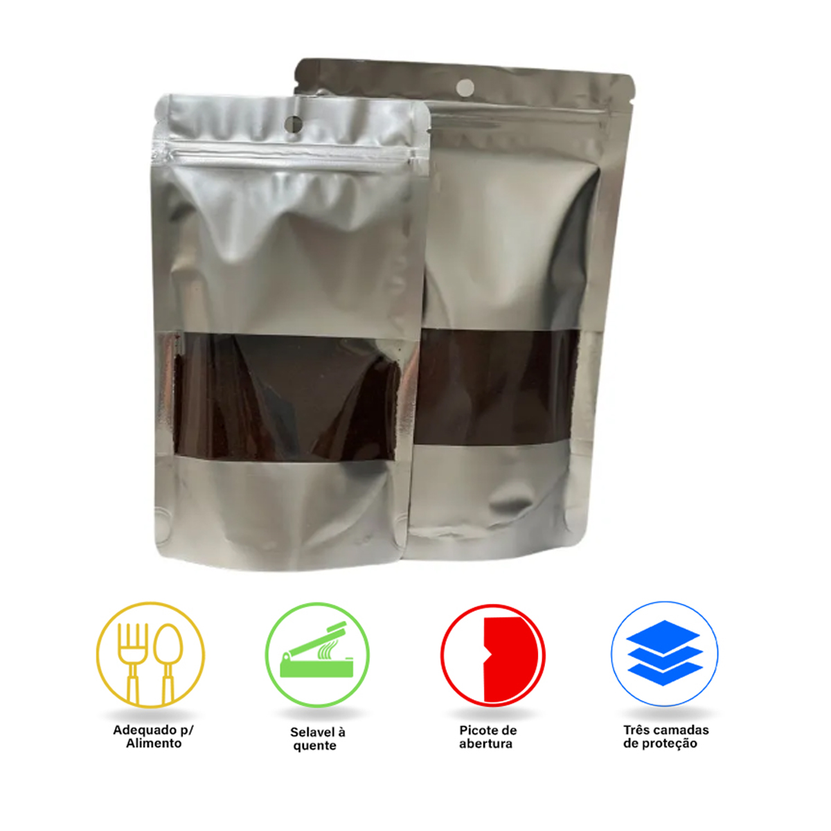Tamanhos da Embalagem Saco Stand Up Pouch Zip Visor Prata Fosco c/ Furo